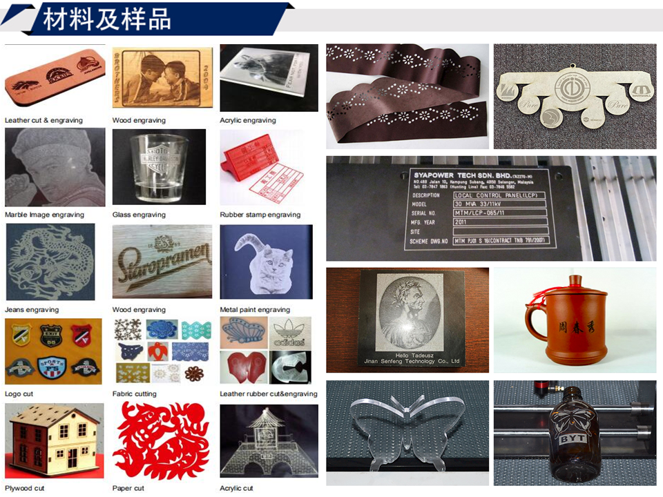 工藝品,家具,玻璃制品,木制品,聚氯乙烯,燈飾,廣告,裝飾,造紙,馬克板,郵票及印章,腈綸,竹制品,手帶及鞋子,衣服和服裝,面料等。通過(guò)對(duì)激光參數(shù)的調(diào)整,機(jī)器可以進(jìn)行多樣的雕刻和切割。這個(gè)機(jī)器具有很多優(yōu)點(diǎn):切口光滑,無(wú)接觸切割,高速雕刻,雕刻準(zhǔn)確、效果好。