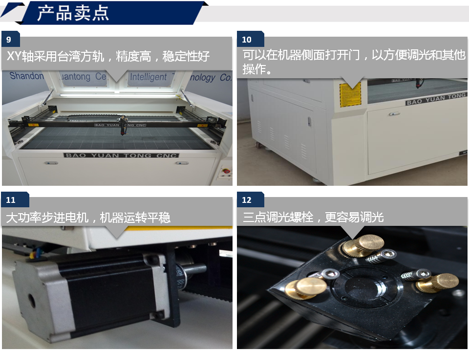3.采用三條進(jìn)口直線導(dǎo)軌,3M同步帶和使用美國(guó)芯片的驅(qū)動(dòng)器,配合大扭距同步電機(jī),使加工物的切割精度和曲線更加精準(zhǔn)平滑;