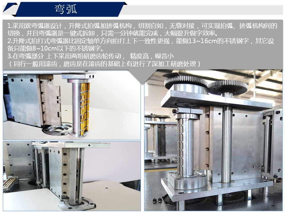 2. 升降式拍打式彎弧器比固定軸單方向拍打上下一致性更強,能做13~16cm的不銹鋼字,其它設(shè)備只能做8~10cm以下的不銹鋼字。