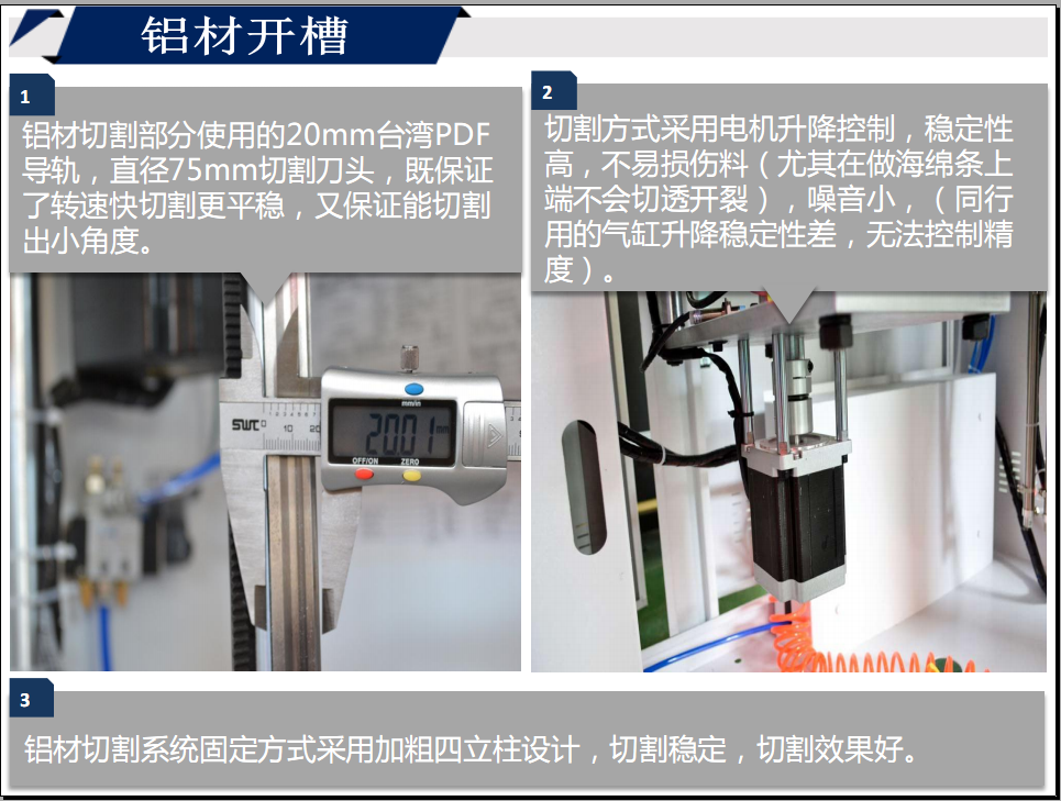 2.切割方式采用電機(jī)升降控制,穩(wěn)定性高,不易損傷料(尤其在做海綿條上端不會(huì)切透開(kāi)裂),噪音小,(同行用的氣缸升降穩(wěn)定性差,無(wú)法控制精度)。