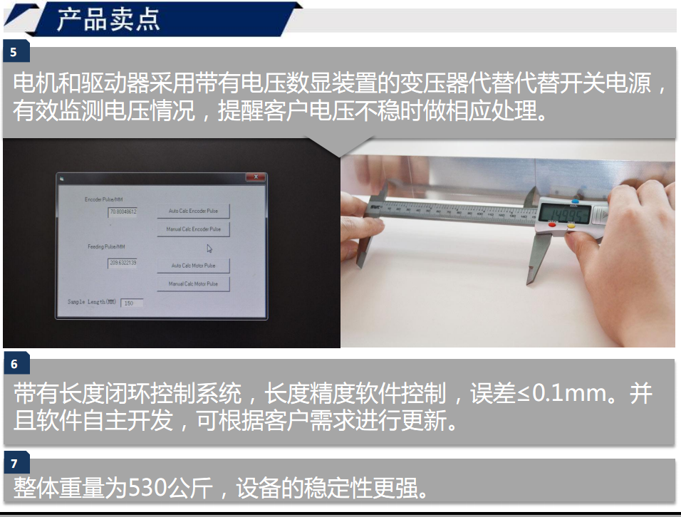 6.帶有長(zhǎng)度閉環(huán)控制系統(tǒng),長(zhǎng)度精度軟件控制,誤差≤0.1mm。并且軟件自主開(kāi)發(fā),可根據(jù)客戶需求進(jìn)行更新。