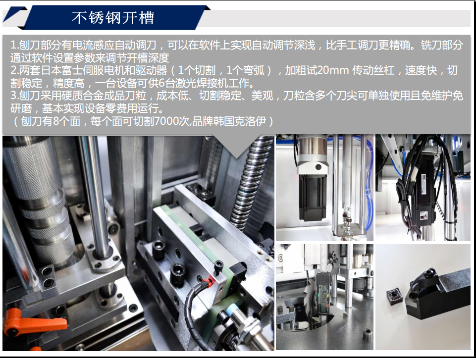 2.兩套日本富士伺服電機(jī)和驅(qū)動(dòng)器(1個(gè)切割,1個(gè)彎?。?,加粗試20mm 傳動(dòng)絲杠,速度快,切割穩(wěn)定,精度高,一臺(tái)設(shè)備可供6臺(tái)激光焊接機(jī)工作。